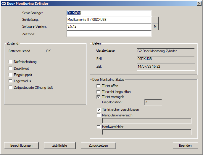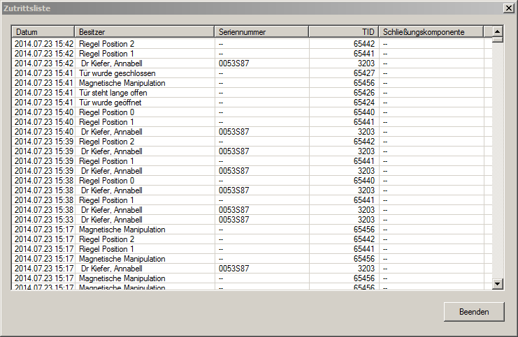- Klicken Sie auf [Zutrittsliste] zum auslesen der Zutritte. Beim Door Monitoring Zylinder werden zusätzlich Riegelpositionen und Türzustände ausgelesen