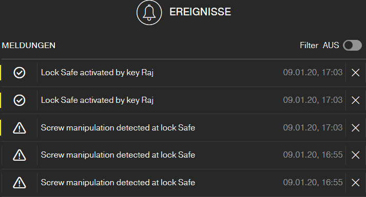 Zutritt | Wählen Sie Schlüssel, Schlösser und einen Zeitraum aus. Wenn einer dieser Schlüssel innerhalb des Zeitraums an einem dieser Schlösser benutzt wird, dann erhalten Sie eine Benachrichtigung. |