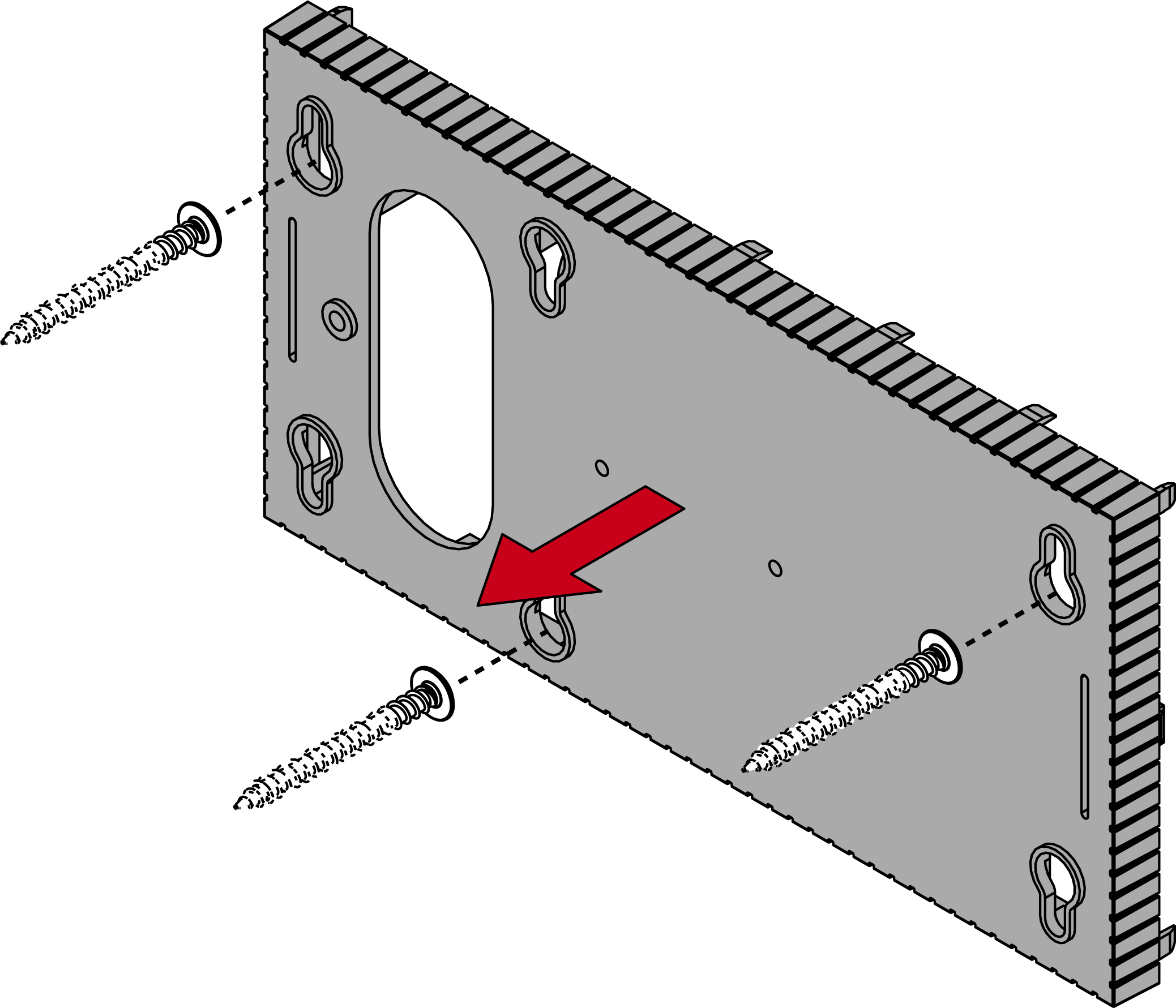 - Verschuif de bodemplaat zodanig dat de schroefkoppen over de groeven worden geschoven.