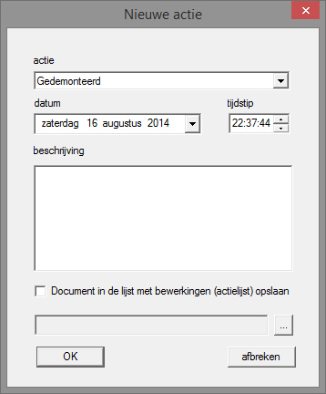Extra acties kunt u via [Toevoegen] protocolleren. Met behulp van het pulldown-menu selecteert u verschillende acties