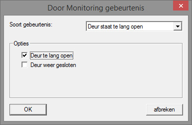 - Deur staat te lang open | Opties: 'Deur te lang open' / 'Deur weer gesloten'