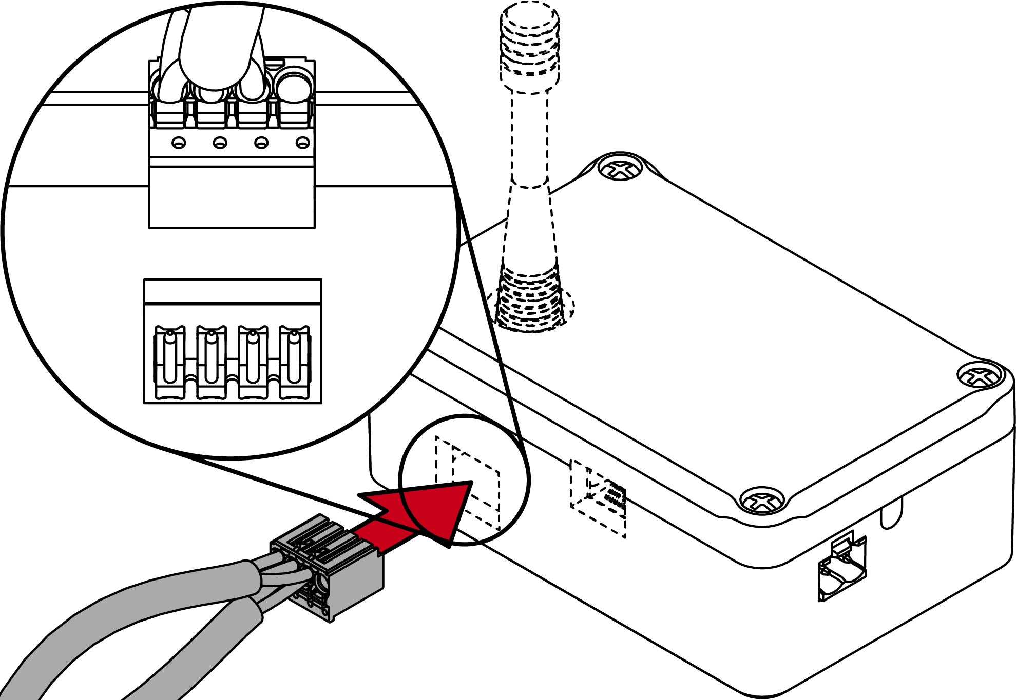 - Then plug the RS-485 cable together with the socket into the RS-485 connection (RS-485 versions only).