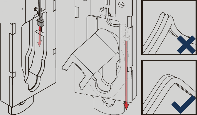 - Guide the cable past the foam insert and down out of the fitting without kinking it.