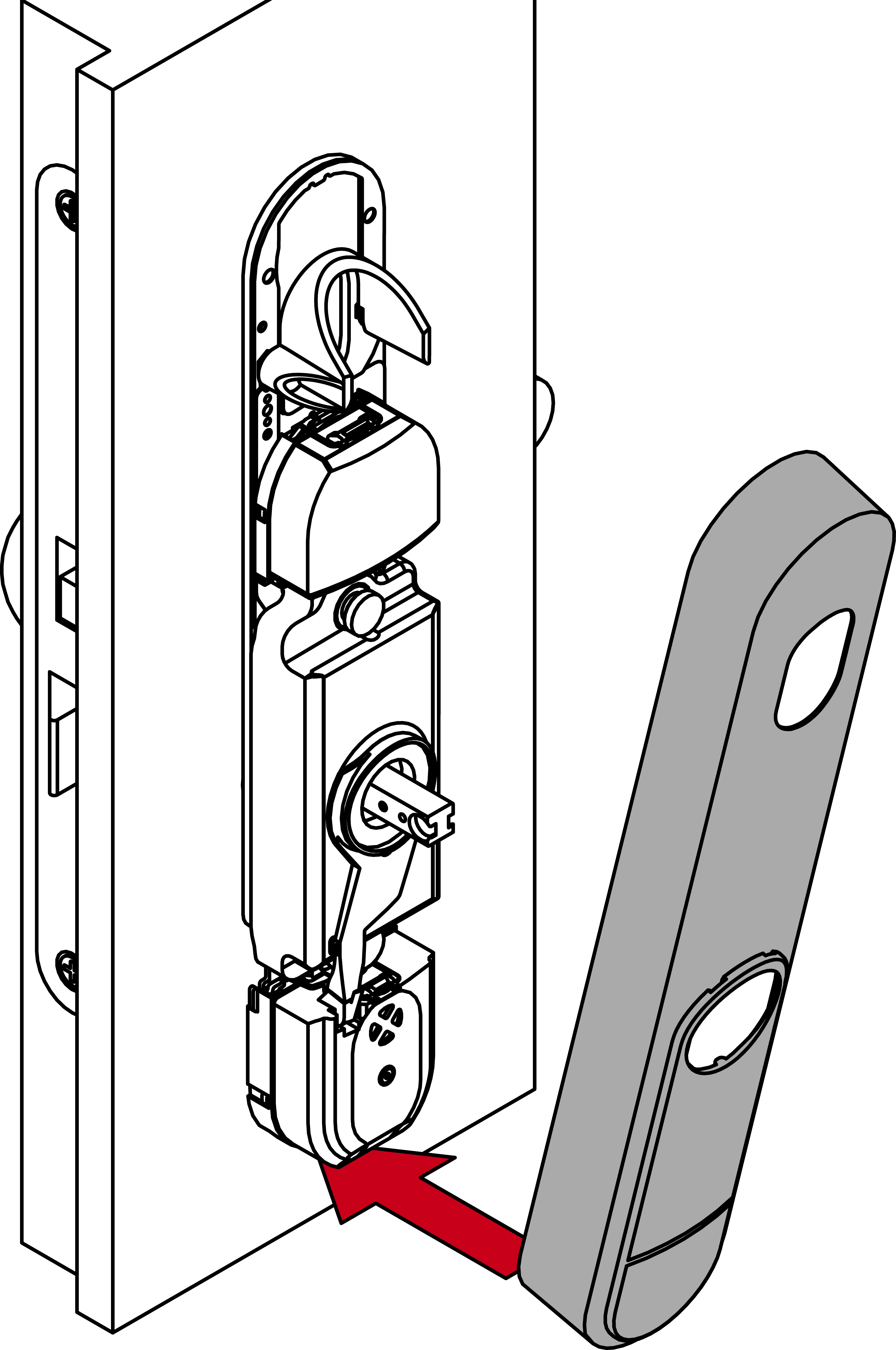 - Insert the module support, the fastening plate and the spindle into the outer side of the door.