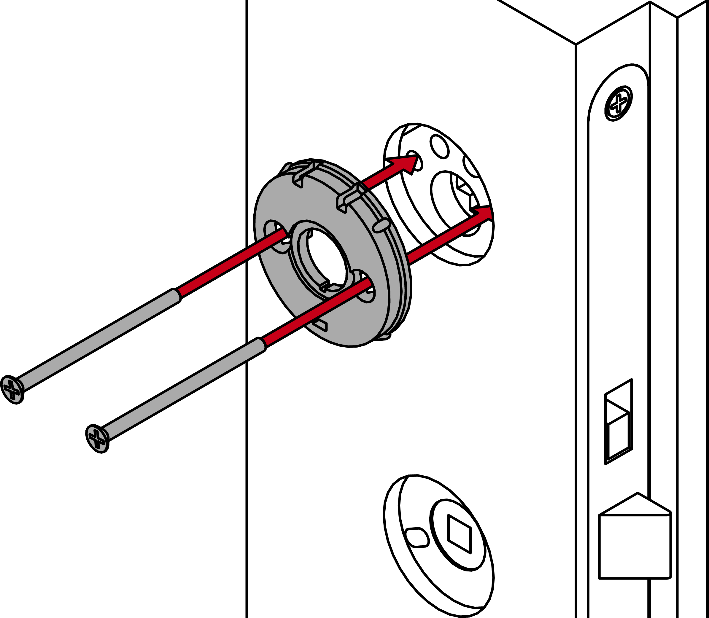 - Place the cylinder plate and the inside handle plate onto the escutcheons.