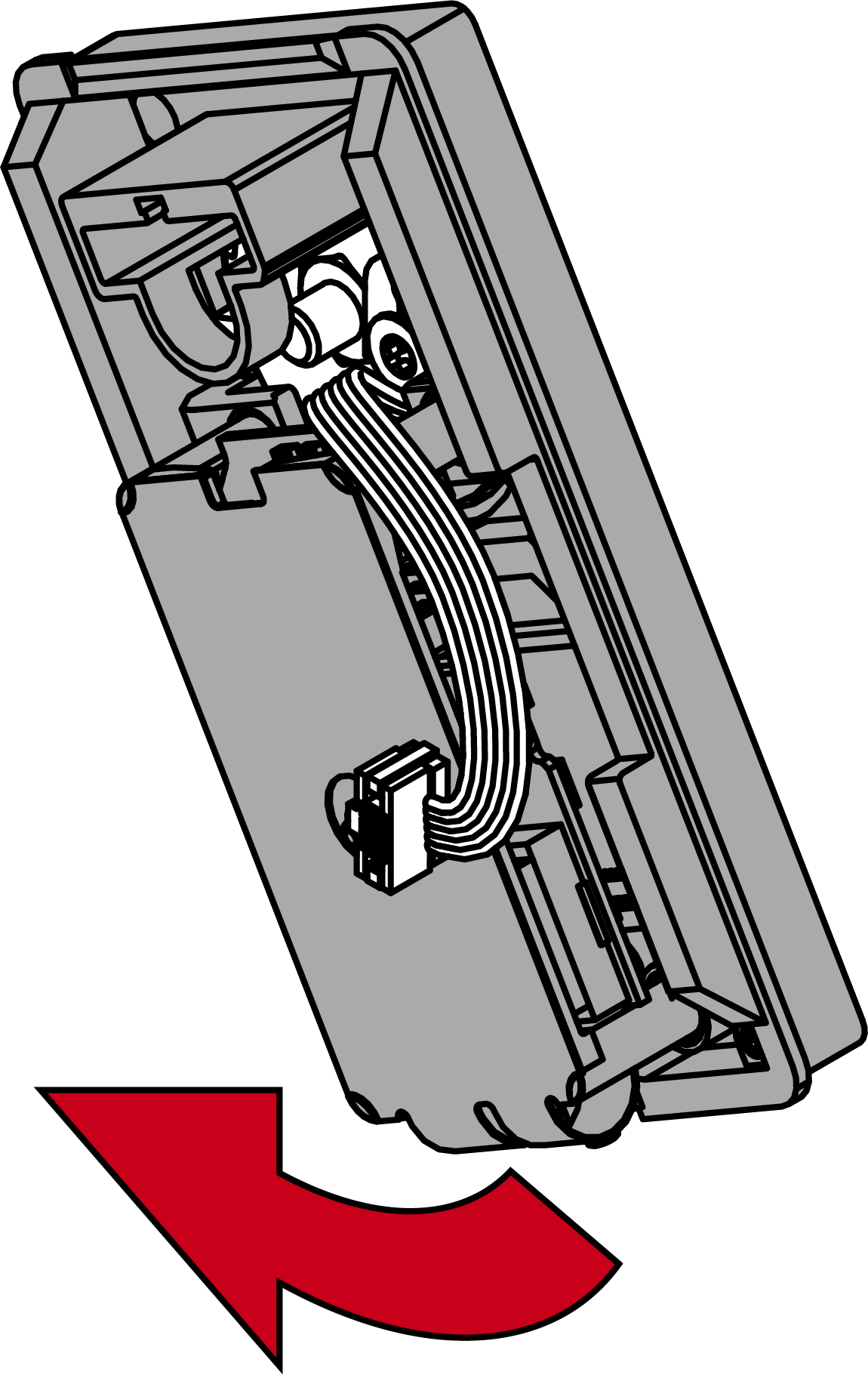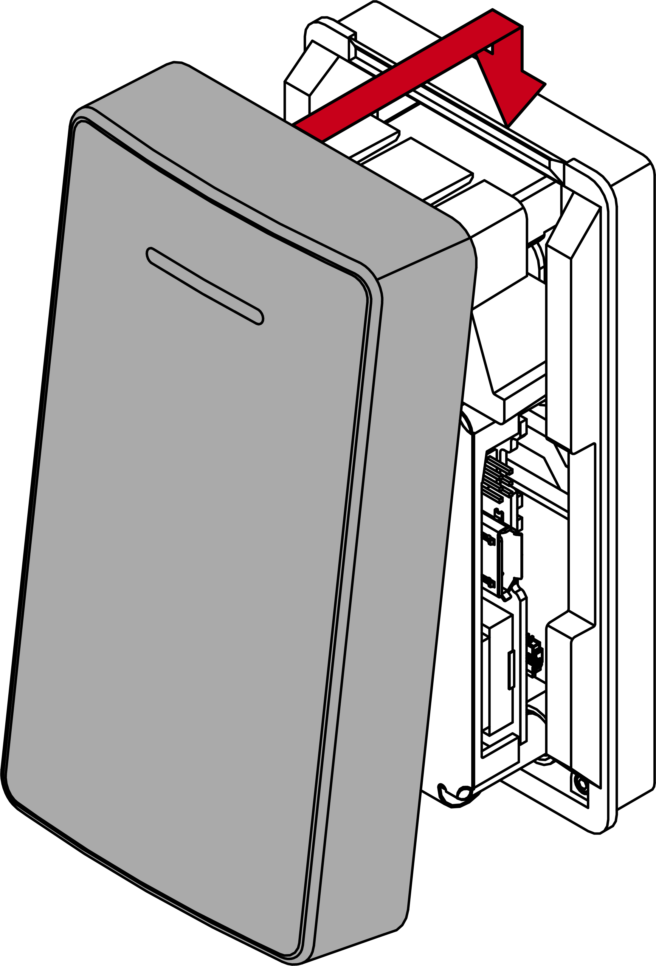 - Gently press the reader cover against the floor and turn the lower screw clockwise inwards until you can lift off the cover.