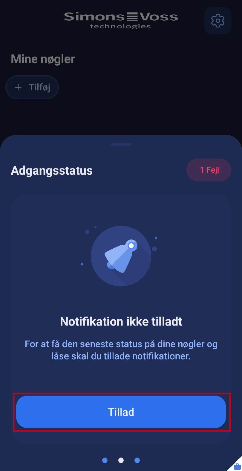 - Notifikationer skal være aktiveret, så du automatisk modtager opdateringer af adgangsrettigheder, og appen giver dig også besked i baggrunden, hvis du ikke er autoriseret. For at gøre dette skal du klikke på feltet . Du vil blive sendt direkte til systemindstillingerne på din smartphone, hvor du kan tillade notifikationer til appen.