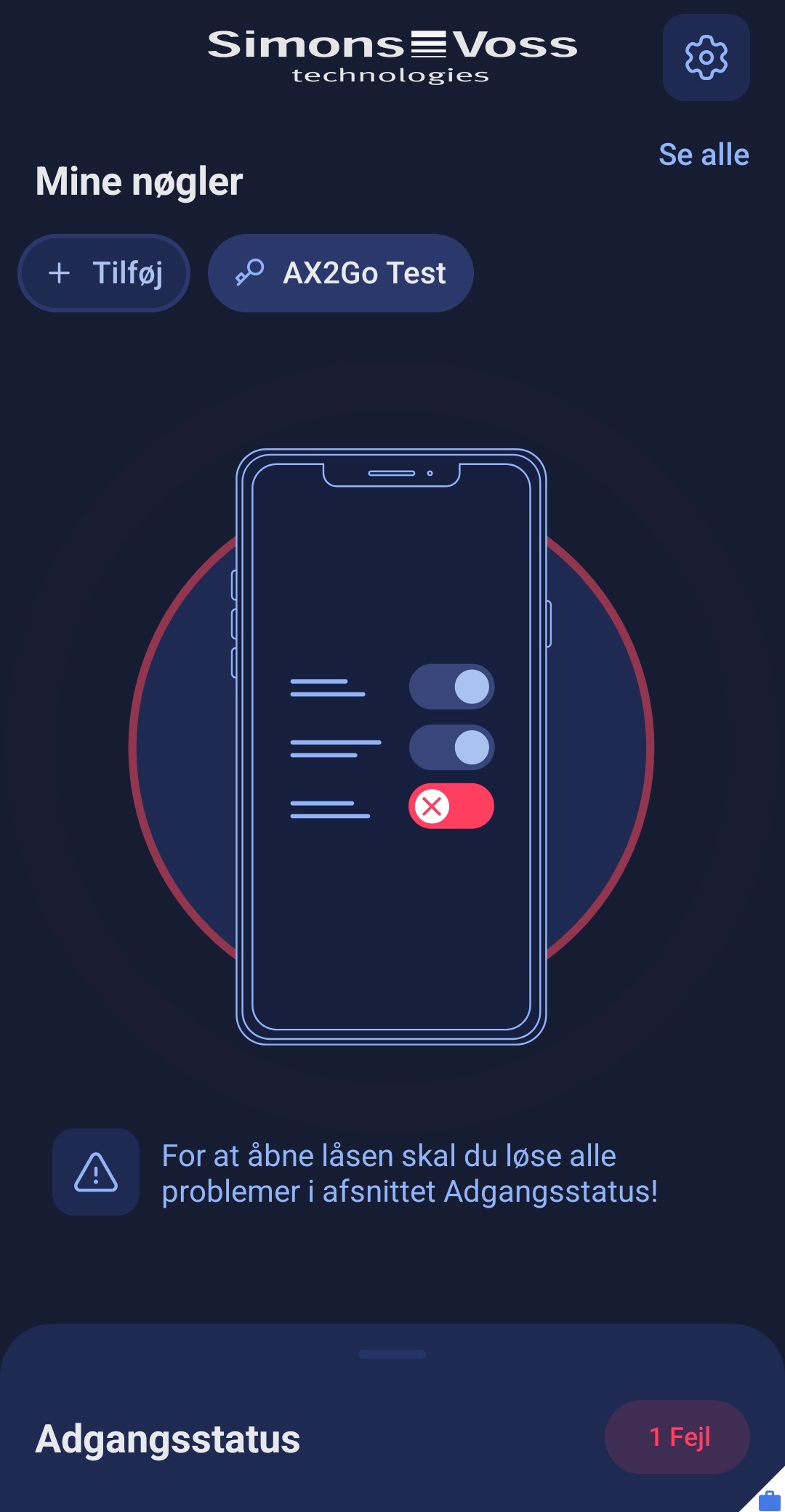 Hvis der opstår fejl, vil du heller ikke kunne åbne låsen, og adgang vil blive nægtet. For at kunne anvende AX2Go -appen igen, skal du afhjælpe alle problemerne i afsnittet Adgangsstatus