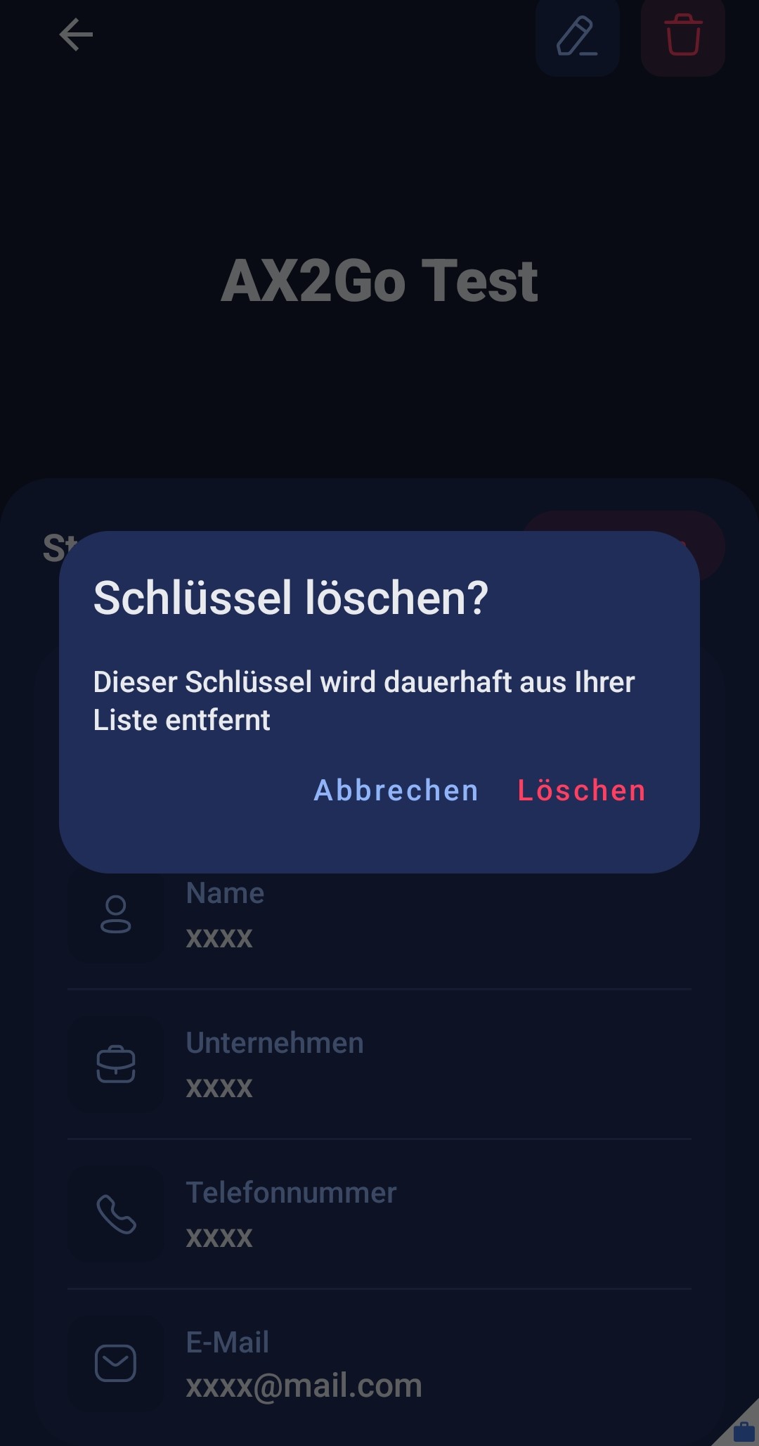 Als Nutzer der AX2Go App können Sie selbst keine Schlüssel löschen. Dies ist nur dann möglich, wenn der Schließanlagenverwalter Ihren AX2Go-Schlüssel widerrufen haben sollte.