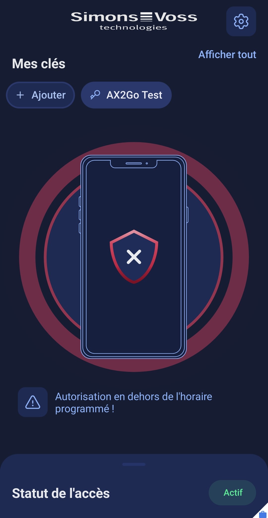L’administrateur du système de fermeture peut vous affecter à un groupe horaire déterminé, c’est-à-dire que vous ne pouvez ouvrir la fermeture qu’à certaines heures. Si vous essayez d’ouvrir la fermeture en dehors des heures du groupe horaire auquel vous avez été affecté, l’accès vous est refusé et vous recevez le message suivant :