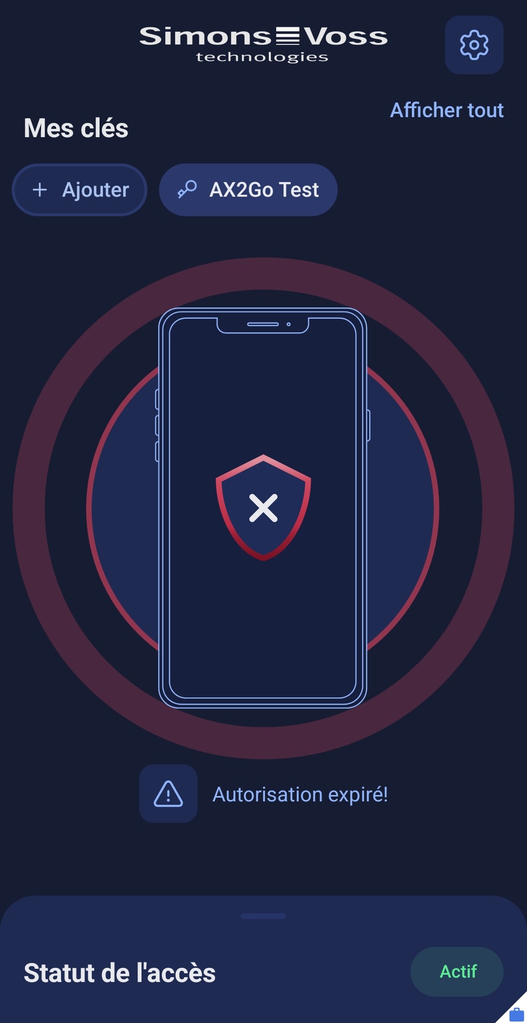 L’administrateur du système de fermeture peut définir une date d’expiration pour votre clé AX2Go. Si vous essayez d’ouvrir la fermeture après cette date d’expiration, l’accès vous est refusé. Votre accès a expiré et vous recevez le message suivant :