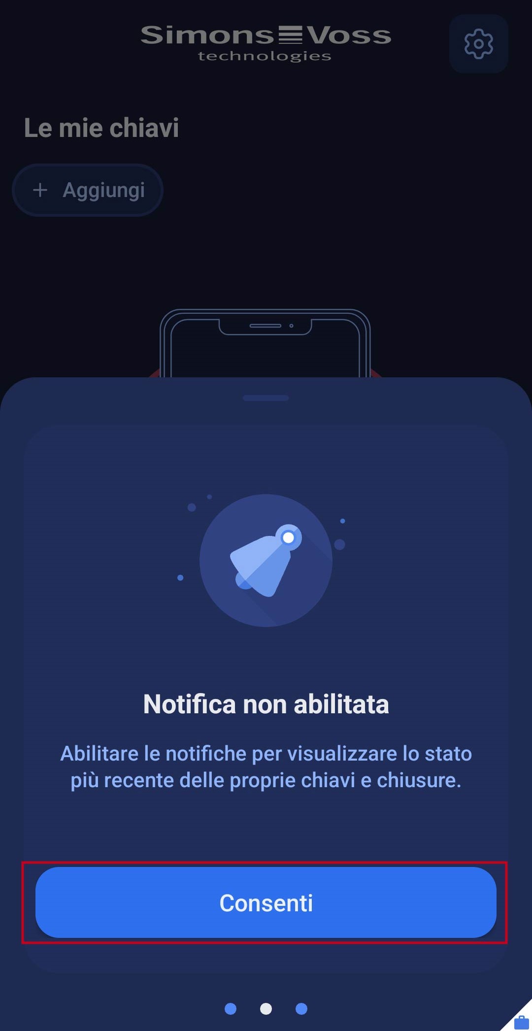 - Al fine di ricevere automaticamente gli aggiornamenti delle autorizzazioni di accesso e per fare in modo che la app notifichi anche in background l'eventuale mancata autorizzazione, è necessario attivare le notifiche. A tale scopo fare clic sul campo . Seguirà l’inoltro diretto alle impostazioni di sistema del proprio smartphone, dove si potrà consentire l’utilizzo delle notifiche per la app.