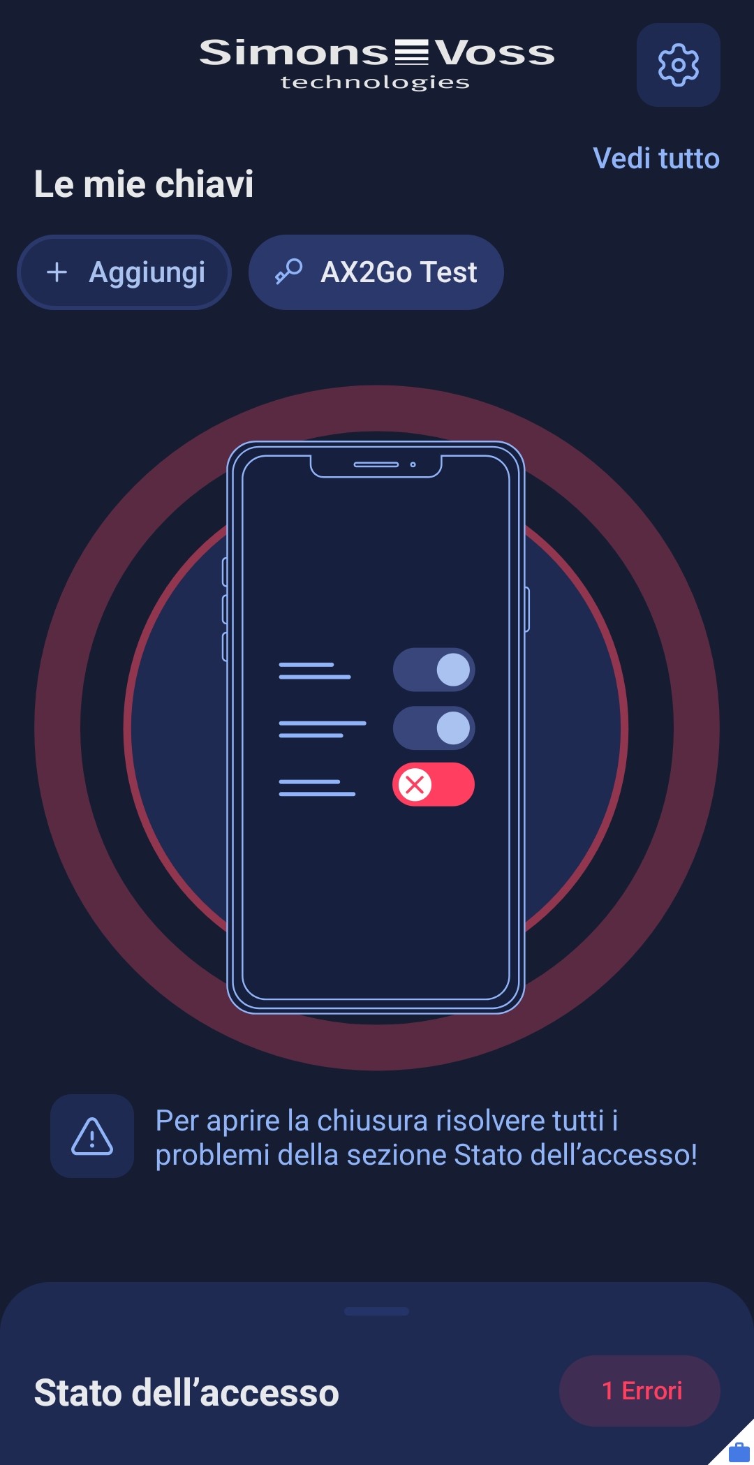Anche in caso di errori non è possibile aprire la chiusura e l’accesso viene impedito. Per poter utilizzare nuovamente la app AX2Go, è necessario risolvere tutti i problemi nella sezione Stato dell’accesso.