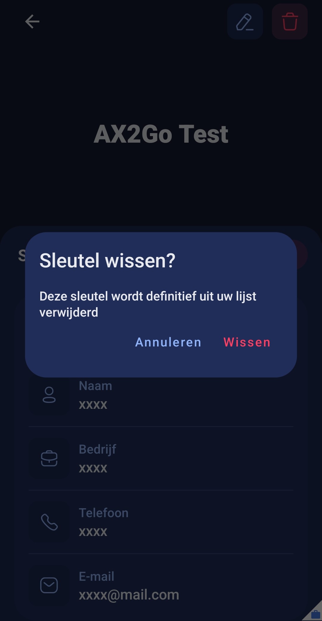 Als gebruiker van de AX2Go-app kunt u zelf geen sleutels wissen. Dit is alleen mogelijk als de beheerder van het sluitsysteem uw AX2Go-sleutel heeft ingetrokken.