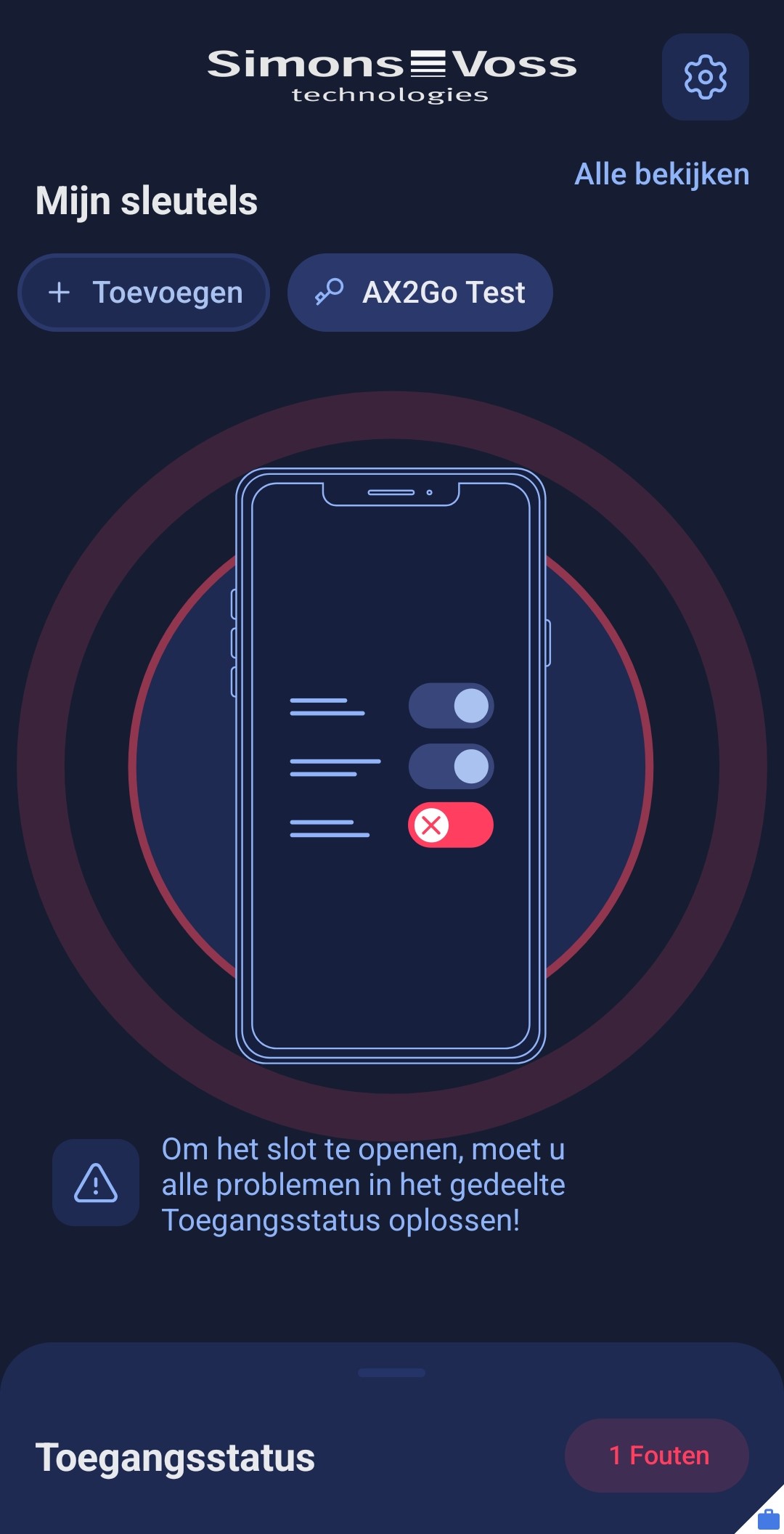 Als er zich fouten voordoen, kunt u het sluitelement ook niet openen en wordt u de toegang geweigerd. Om de AX2Go app weer te kunnen gebruiken, moet u alle problemen in de alinea Toegangsstatus oplossen.