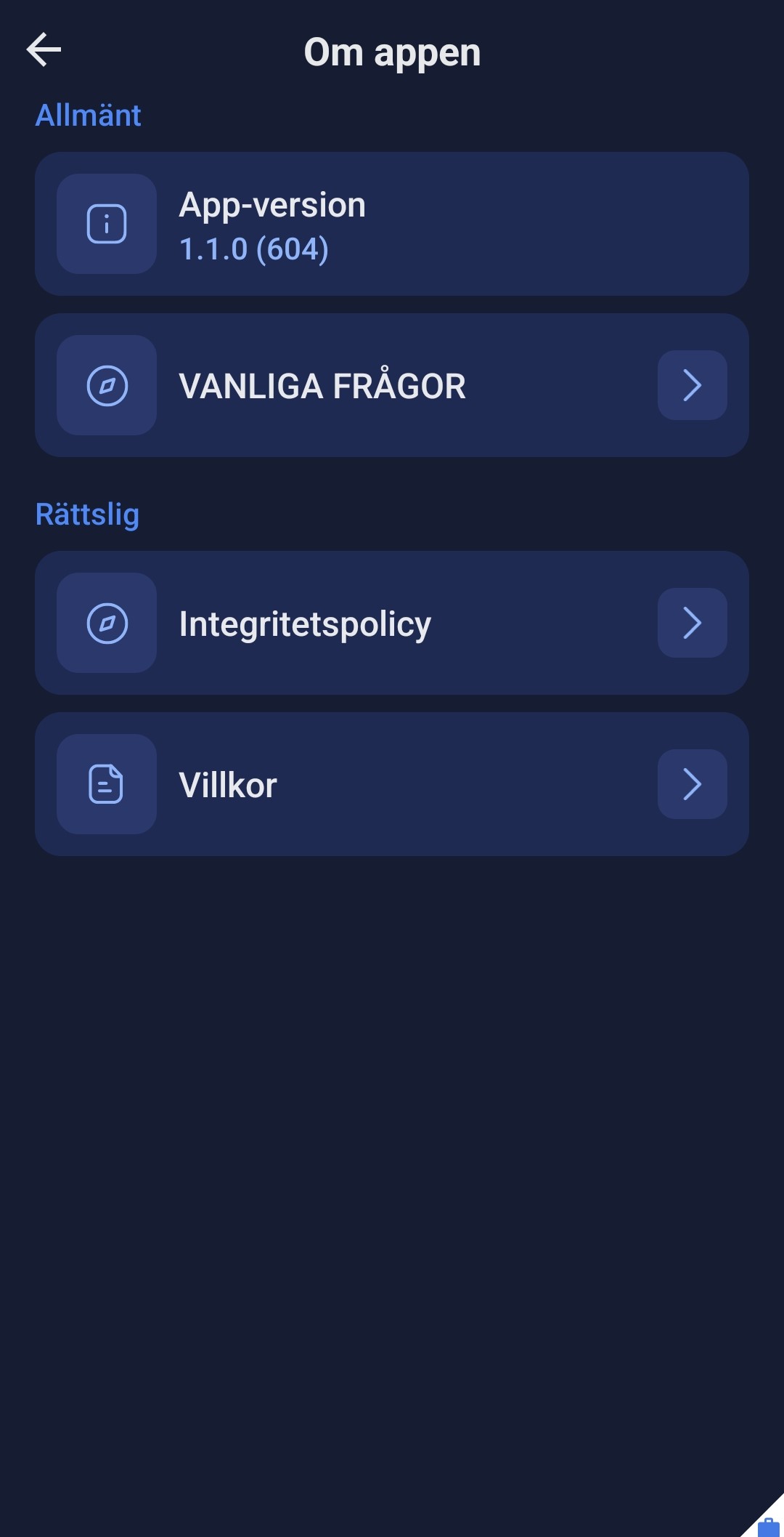 Rubrikerna Vanliga frågor, Integritetspolicy och Användarvillkor är länkade till motsvarande SimonsVoss-internetsidor.