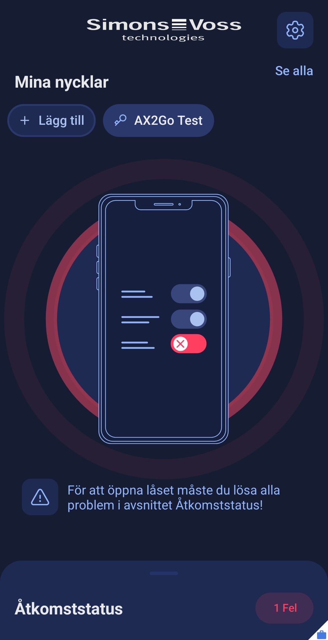 Om fel uppstår kan du inte öppna låset och tillträde nekas. För att kunna använda AX2Go-appen igen måste du åtgärda alla problem i avsnittet Åtkomststatus.
