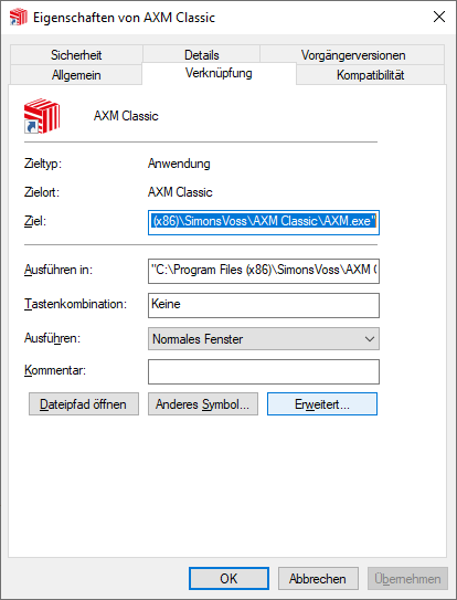Deshalb empfiehlt SimonsVoss, die Eigenschaften der Verknüpfung zur AXM Classic so einzustellen, dass die AXM Classic über diese Verknüpfung immer als Administrator ausgeführt wird.