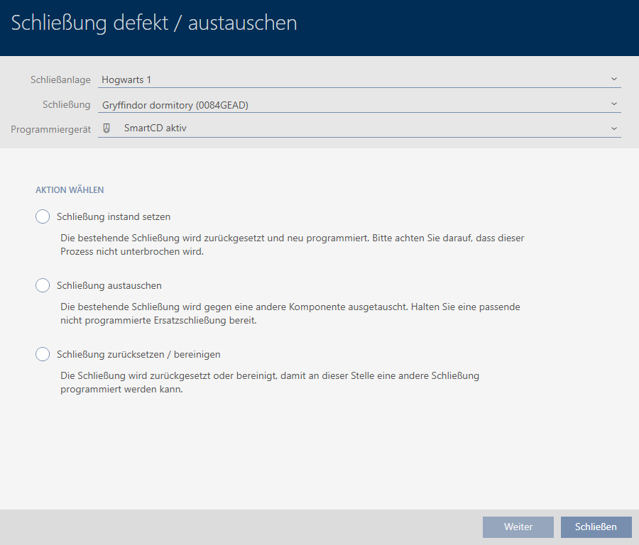 . - Assistent zum Behandeln einer defekten Schließung öffnet sich.