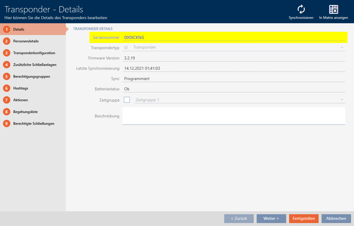 - Serial number (permanently stored in the identification medium and imported during synchronisation)