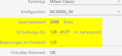 Memory requirements and the locking device ID section are interlinked: The more locking device IDs you write on the card, the greater the memory you require is. Example: The MC8000L_AV template can manage eight times more locking devices, but it also requires four times as much memory on the card: