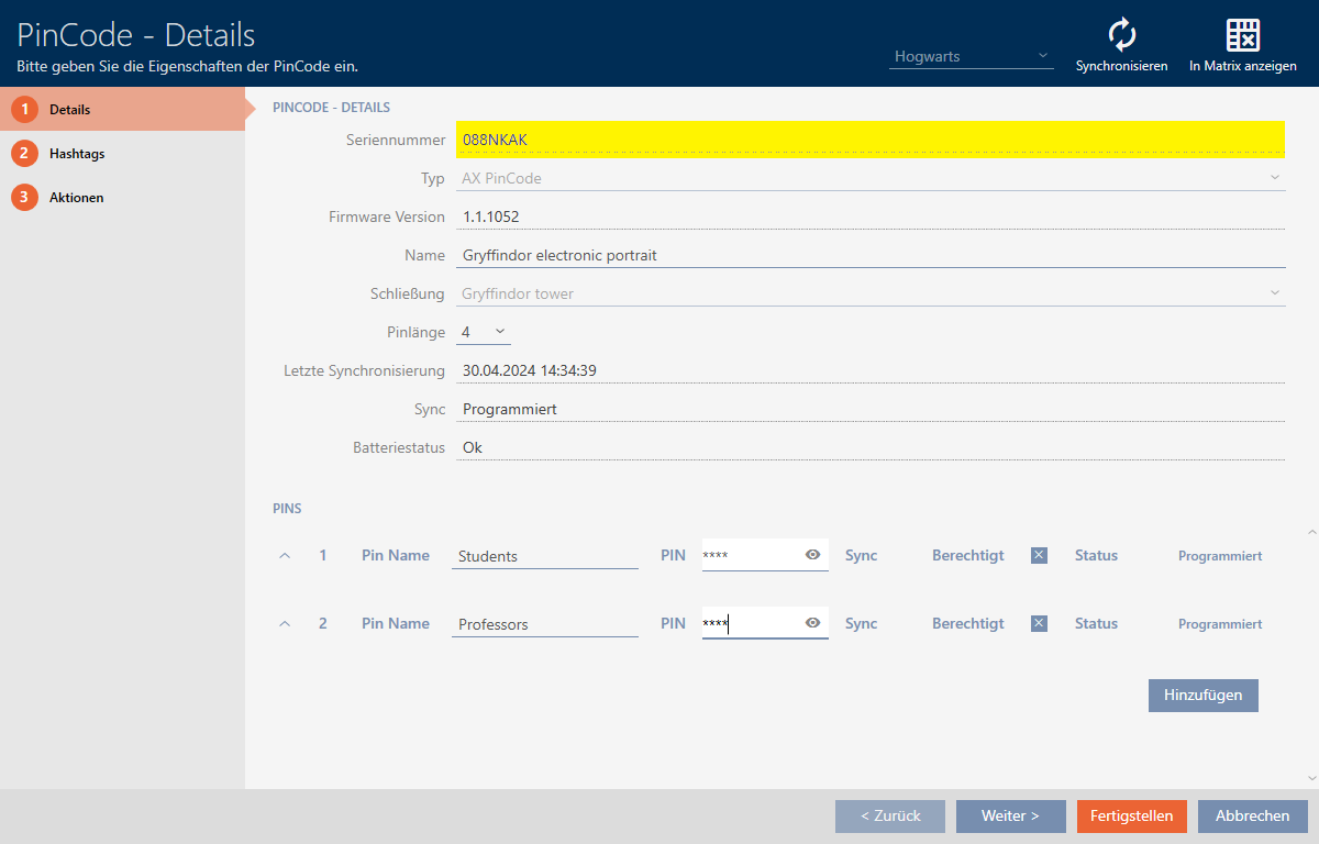 (voir Trier et filtrer). - Cliquez sur un code PIN du clavier PinCode dont vous souhaitez consulter le numéro de série.