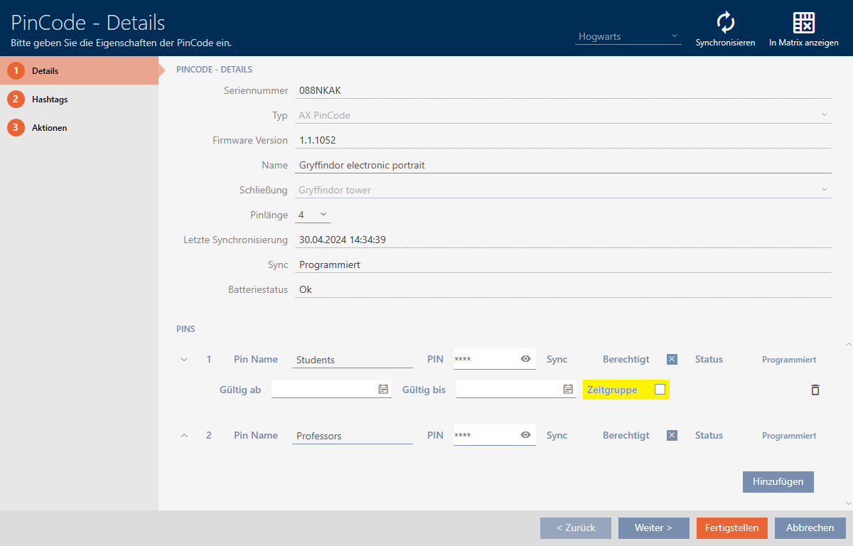 Ajouter des codes PIN d’un clavier PinCode au groupe horaire - AXM Classic