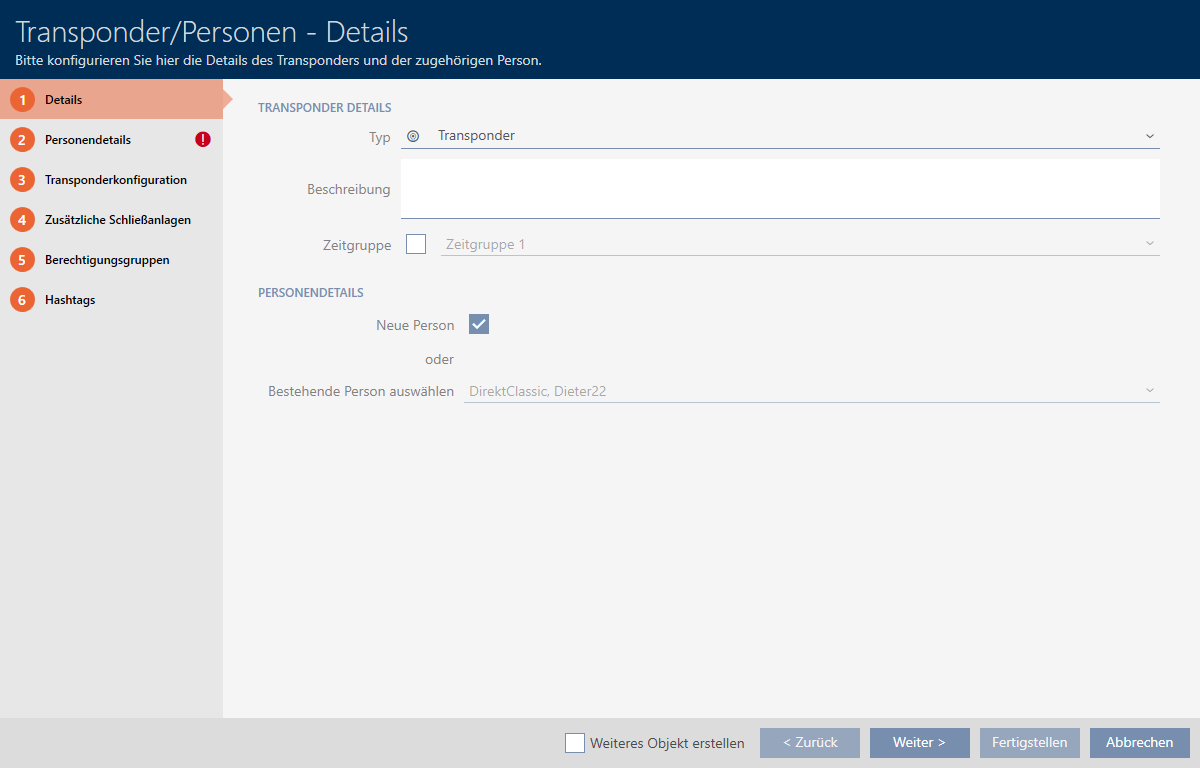 - La AXM Classic crée automatiquement une nouvelle personne pour le nouvel identifiant. Désactivez cette case pour sélectionner une personne déjà disponible (par exemple, pour un identifiant de remplacement).