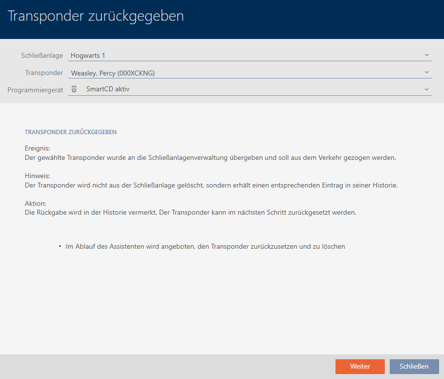 Le retour réussi est noté dans la liste des actions du support d’identification (voir aussi Planifier et consigner la restitution des transpondeurs/cartes).