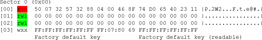 - Les secteurs disponibles sont reconnaissables dans le rapport aux trois blocs avec [rwi] : read/write/increment. Le quatrième bloc est destiné au chiffrement.