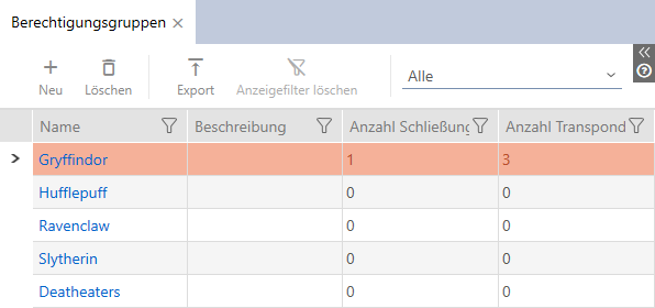 Vous pouvez également exporter les groupes d’autorisation affichés sous forme de liste (voir Exporter les groupes d’autorisation sous forme de liste).
