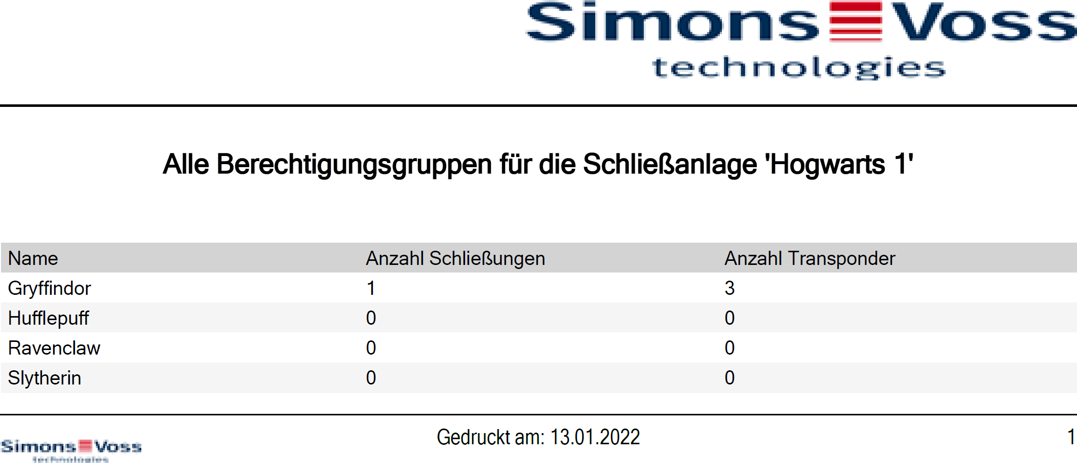 - Les groupes d’autorisation affichés sont exportés dans un fichier au format PDF (DIN A4).