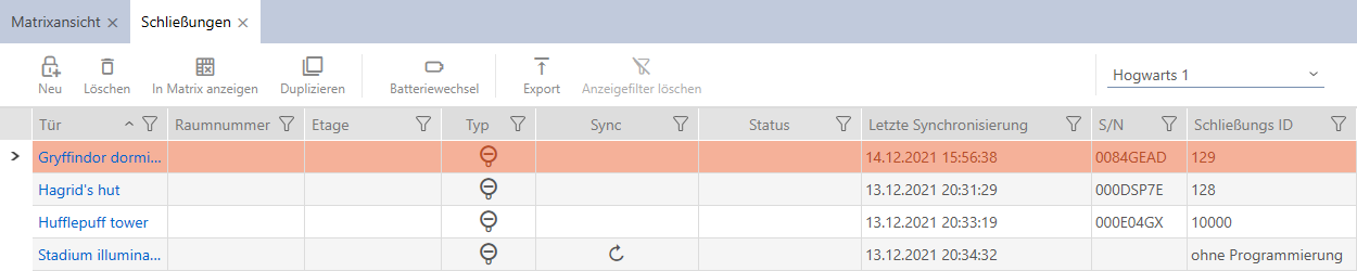 - Lijst met alle in het sluitsysteem aanwezige sluitelementen gaat open.