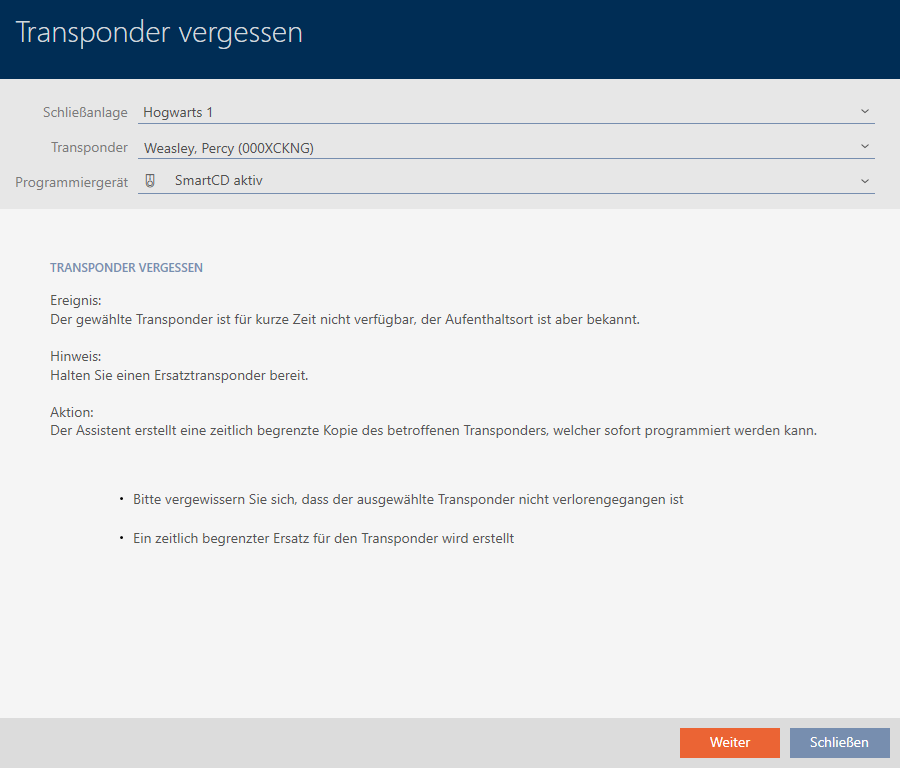 Medewerkers die hun identificatiemedium vergeten zijn, kunnen een kopie met afloopdatum ontvangen. Het resetten of wissen vervalt in dit geval, omdat geen onbevoegde toegang tot het vergeten identificatiemedium heeft.
