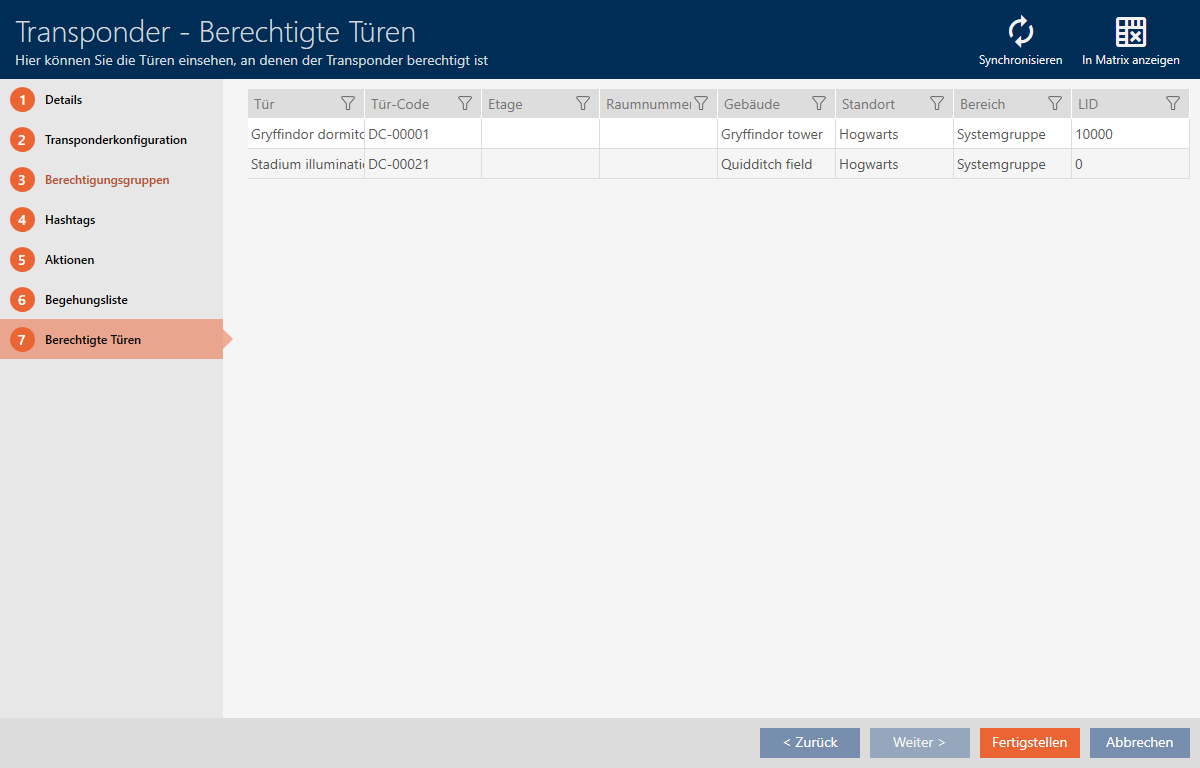 (se Sortering og filtrering). - Klik på det identifikationsmedium, hvor du vil vide, ved hvilke døre det er berettiget.