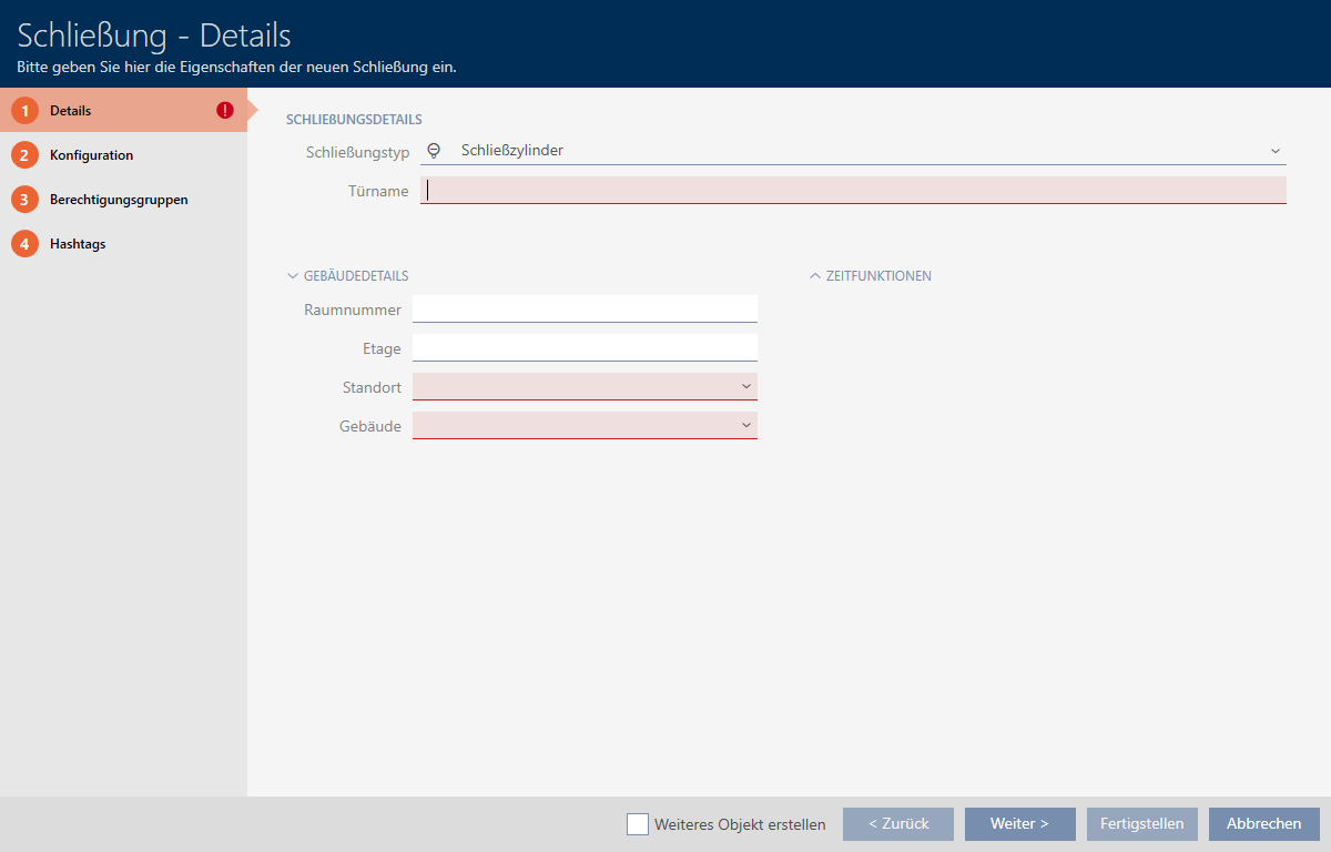 - Hvis du vil anvende tidsfunktioner: Åbn menuen , og udfør indstillingerne (detaljer, se Begrænsning af rettigheder til låse til bestemte tider (tidsplan) og Automatisk indkobling og udkobling af låse med tidsændring).