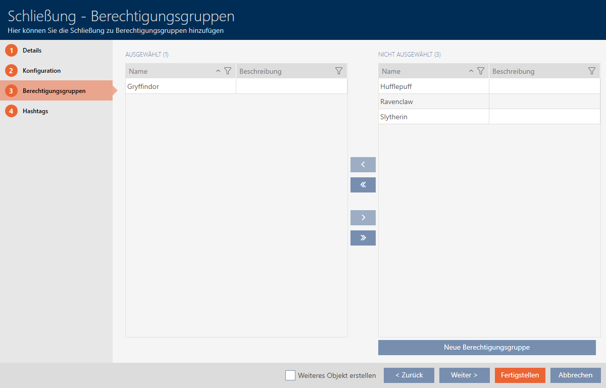 (se Sortering og filtrering). - Vælg alle autorisationsgrupper, som du vil tildele din lås til (Ctrl+museklik for en enkelt eller Shift+museklik for flere).