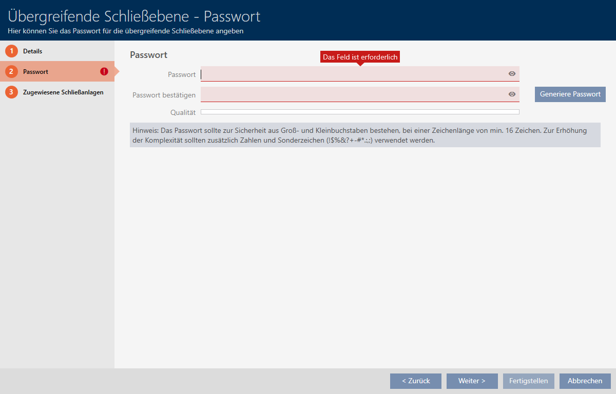 - Geben Sie im Feld das Passwort für Ihre übergreifende Schließebene ein.