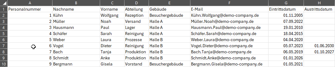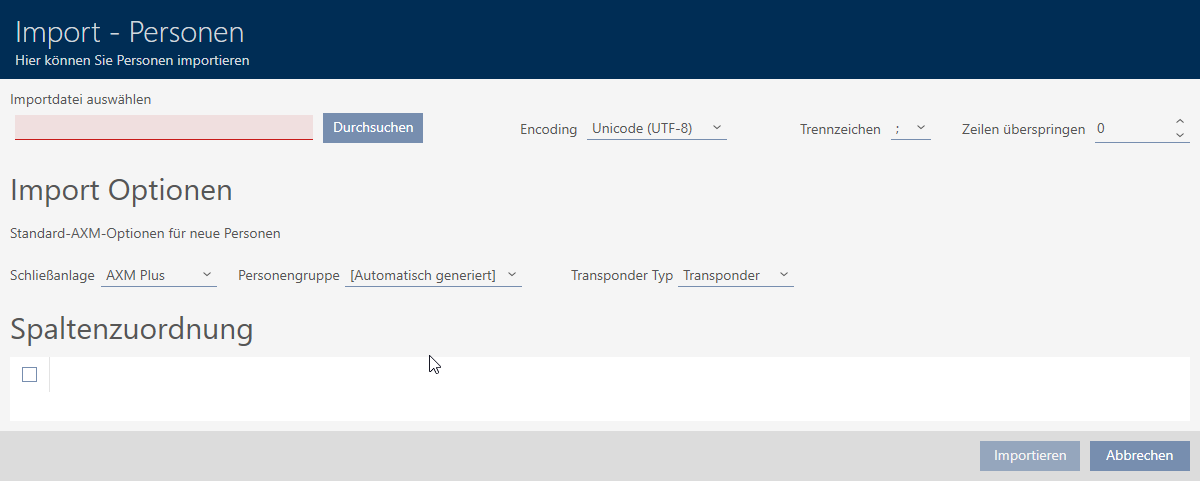 Mit der Importfunktion können Sie viele Identmedien/Personen auf einmal anlegen. Dazu benötigen Sie eine Importdatei im Format CSV oder XLSX. Die Spalten in dieser Datei weisen Sie anschließend einem Feld in der AXM Lite zu. Mit jeder Zeile wird ein neues Identmedium (und eine neue Person) angelegt und die Felder mit den Inhalten der jeweiligen zugewiesenen Spalten befüllt.