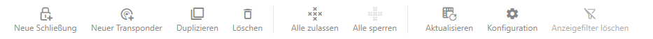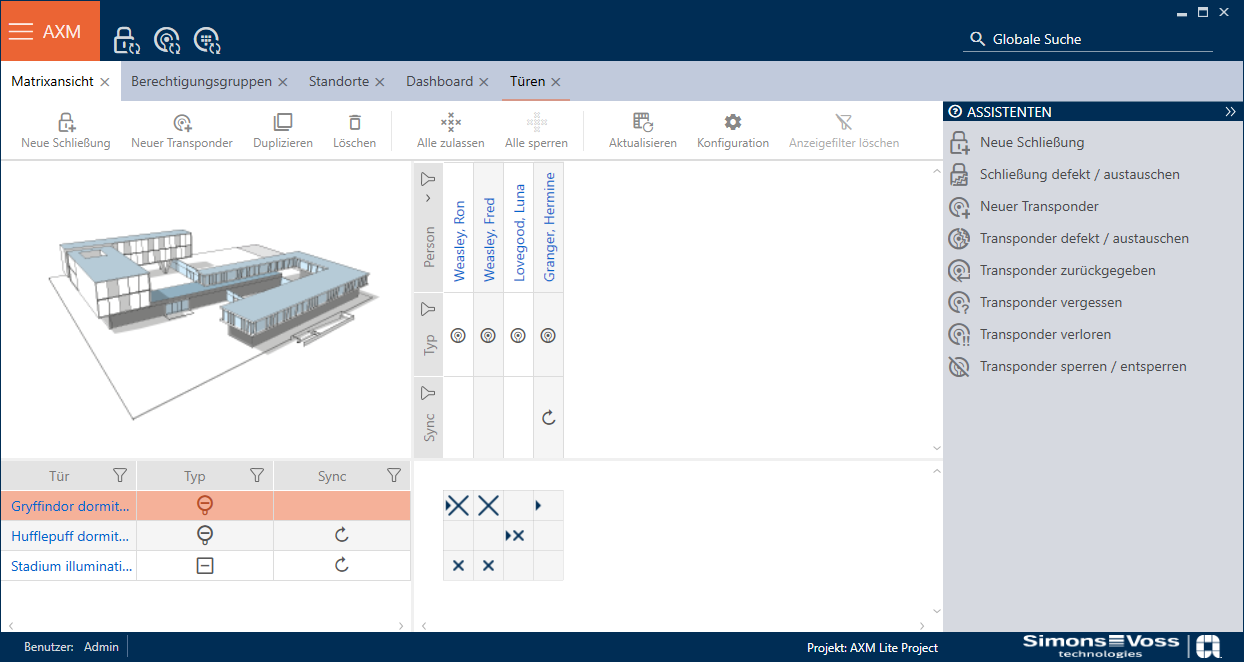 Der Matrixbereich ist der Maschinenraum Ihrer AXM Lite. Hier sehen Sie alle Schließungen und Identmedien. Mit der Filterfunktion blenden Sie Einträge aus und verschaffen sich so einen Überblick (siehe Sortieren und Filtern).