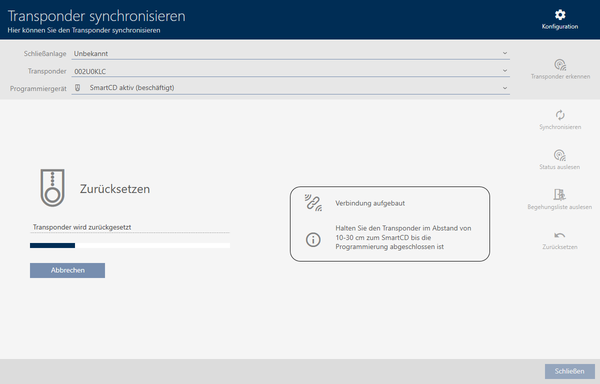 Bevor Sie eine Komponente wie einen Transponder wieder für ein Identmedium oder eine andere Schließanlage verwenden können, müssen Sie sie zurücksetzen.