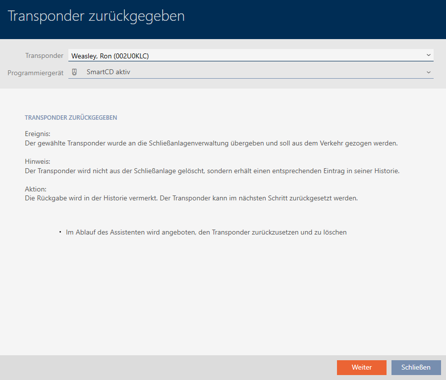The successful return is noted in the identification medium’s action list (also see Planning and logging card/transponder return).