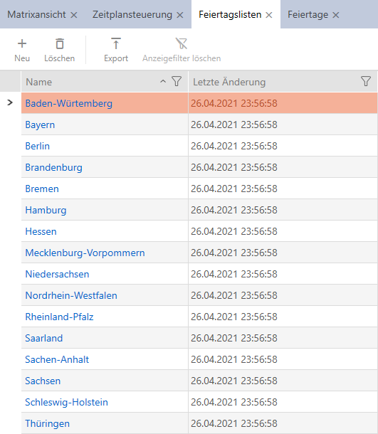 to sort/filter the displayed entries if required (see Sorting and filtering). - Select all public holidays that you wish to assign to your public holiday list (Ctrl+click for single days or Shift+click for multiple days).