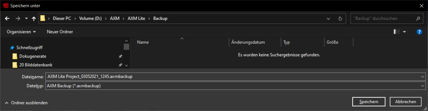 - Enregistrez le fichier de sauvegarde (extension : .axmbackup) dans le répertoire de fichiers de votre choix.