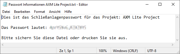 - Saisissez vous-même le mot de passe du plan de fermeture dans le fichier texte ou veillez à ce que le nouveau mot de passe du plan de fermeture soit consigné.