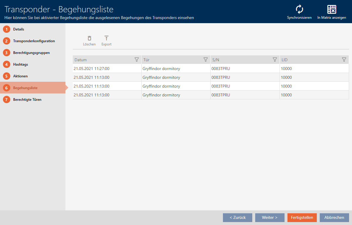 Si vous le souhaitez, vos supports d'identification peuvent consigner les fermetures sur lesquelles ils ont été utilisés (voir Faire enregistrer les accès par le support d'identification (liste de passages)). Les entrées enregistrées dans cette liste de passages sont ensuite transférées dans la base de données, par exemple lors d'une synchronisation (voir Synchroniser un identifiant/une carte (y compris lire la liste de passages)).