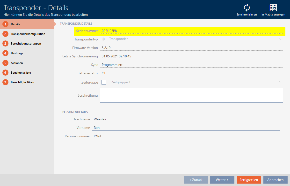 - Numéro de série (enregistré en permanence sur le support d’identification, lu lors de la synchronisation)