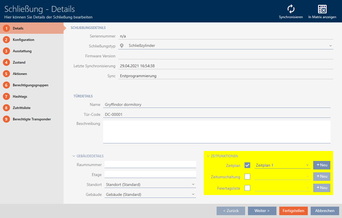 Nel caso ideale create i vostri programmi delle fasce orarie ancora prima delle chiusure (vedere Best Practice: Realizzazione dell’impianto di chiusura). In seguito potete aggiungere le vostre chiusure al programma mentre state creando la chiusura (vedere Creazione di una chiusura).