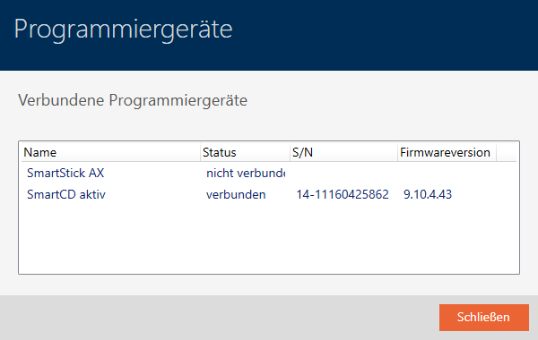 Dit venster toont alle ondersteunde programmeerapparaten. Naargelang de editie van de AXM die u gebruikt, worden andere programmeerapparaten ondersteund (zie Functieomvang AXM Lite). In de statuskolom ziet u of een programmeerapparaat is aangesloten en door de AXM Lite wordt herkend.