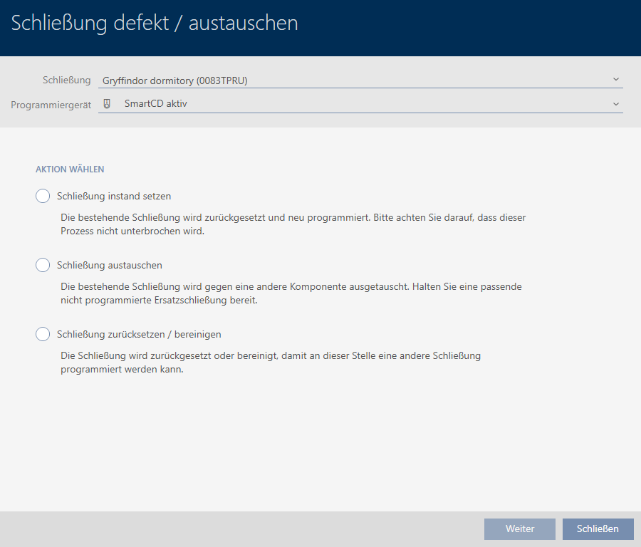 . - Assistent för behandling av ett defekt lås öppnas.